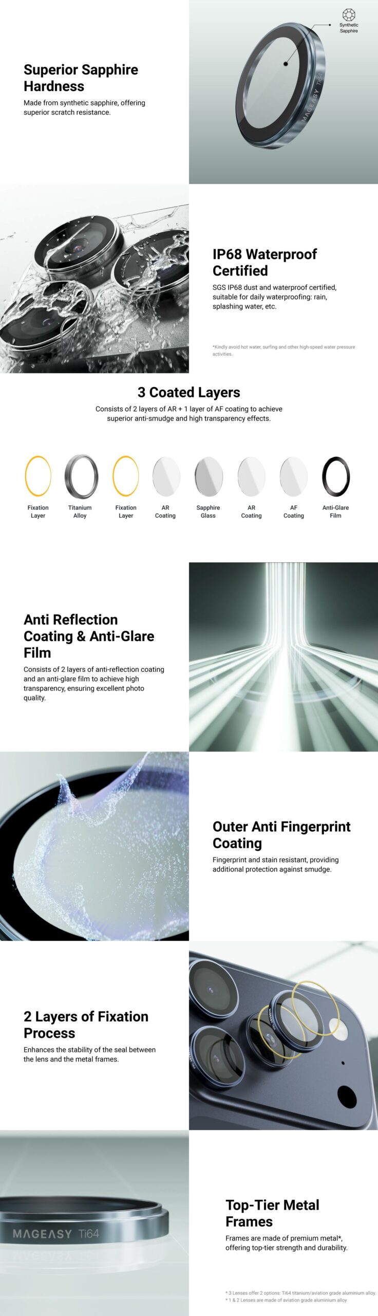 Lights, camera, action! As your iPhone becomes your creative companion, protecting the camera is more important than ever. The MAGEASY Lenz Sapphire Camera Lens Protector is made from synthetic sapphire and is IP68 waterproof and dust-resistant, SGS certified, safeguarding your lenses from scratches, cracks, and stains. The exclusive 3-layer coating, plus a 2-step fixation process, ensures no light refraction or scattering, creating the ultimate shooting experience at your fingertips. Plus, it comes in various color options to either match your iPhone or choose the one that makes you shine. Install effortlessly and enjoy an upgraded iPhone photography experience now.