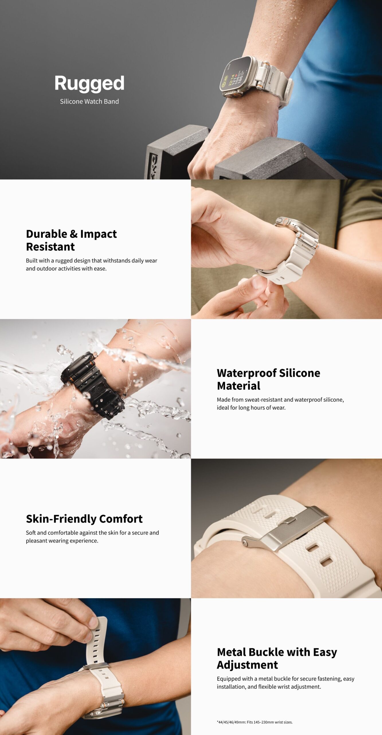 The Rugged Silicone Waterproof Band is built with a durable, impact-resistant design that easily handles outdoor sports and daily use. Made from waterproof silicone, it offers a soft, skin-friendly fit for long-lasting comfort. Equipped with a secure metal buckle, it stays firmly in place while allowing quick installation and easy adjustment.